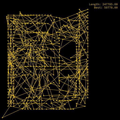 Das Traveling Salesman Problem (TSP) ist ein Klassiker der kombinatorischen Optimierung. Gegeben sind n Punkte (Städte). Gesucht ist die kürzeste geschlossene Rundreise, die jeden Punkt genau einmal besucht. Der Suchraum wächst exponentiell, weshalb in der Praxis nahezu ausschließlich heuristische Verfahren eingesetzt werden. Solche Verfahren liefern nicht zwangsläufig die optimale Rundreise, erreichen aber in kurzer Zeit sehr gute Lösungen. Im hier betrachteten Beispiel (TSPLIB pcb442) liegt die beste gefundene Tourlänge bei einem Abstand von etwa 0,13 % zum bekannten Optimum.